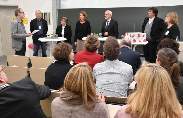 Eingebettet in das wissenschaftliche Programm war weiterhin ein Festakt am Freitag, mit dem feierlich das Ende der Projektlaufzeit beschlossen wurde. Nach dem Festvortrag der Sprecherin des Kollegs – Frau Prof. Dr. Annette Scheunpflug von der Otto-Friedrich-Universität Bamberg – folgte ein persönlicher Rückblick und Dank von Marina Wagener und Julia Reimer, die als Kollegiatinnen beide von der Hans-Böckler-Stiftung im Rahmen eines Promotionsstipendiums gefördert wurden. Anschließend nahmen Vertreterinnen und Vertreter der Hochschulleitung aus den vier beteiligten Institutionen sowie Dr. Jens Becker von der Hans-Böckler-Stiftung im Rahmen einer moderierten Grußwortrunde zur Arbeit und zur Struktur des Kollegs Stellung. Der offizielle Festakt wurde mit der Überreichung eines Zertifikats an alle Kollegiatinnen und Kollegiaten über die Teilnahme am strukturierten Studienprogramm des Kollegs beschlossen.