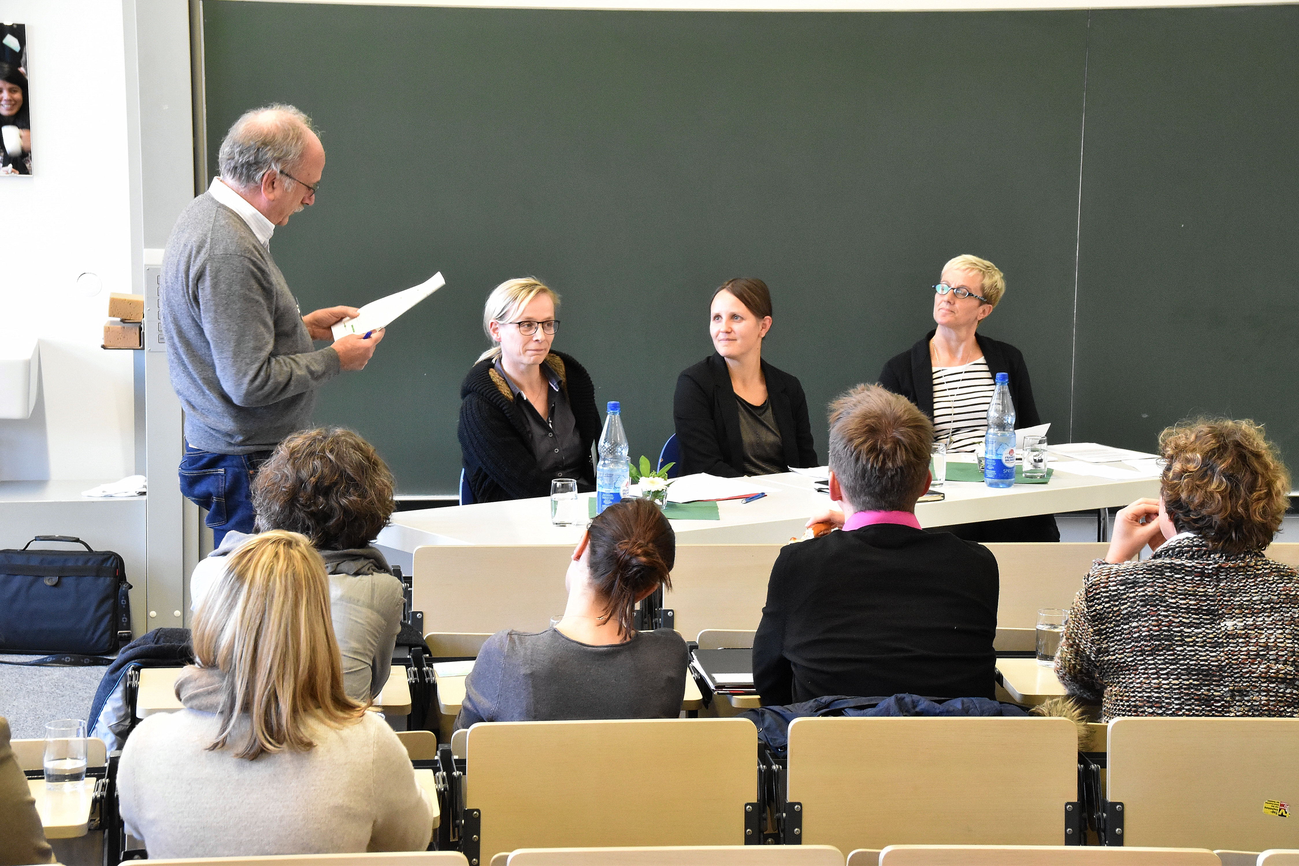 Podiumsdiskussion mit Prof. Dr. Cathleen Grunert (2. v. links) Prof. Dr. Nicolle Pfaff (3. v. links) Moderation: Prof. Dr. Gerhard Riemann (links außen) von der Technischen Hochschule Nürnberg Georg Simon Ohm sowie Prof. Dr. Bärbel Kopp von der FAU Erlangen-Nürnberg (rechts außen) |